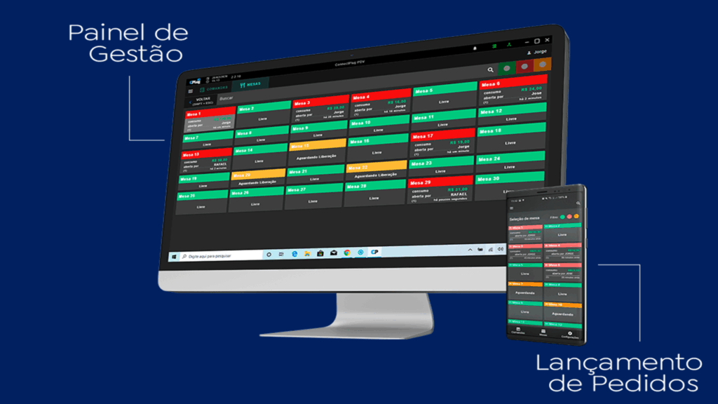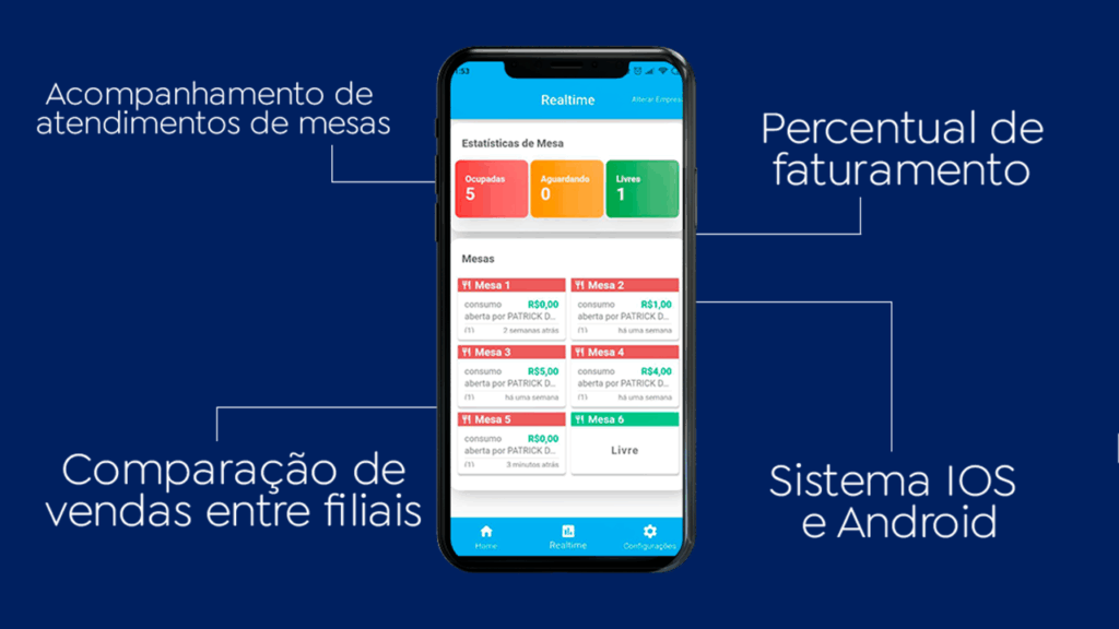 Acompanhamento da operação em tempo real. É possível visualizar e conferir as vendas e os atendimentos das mesas através de um smartphone.