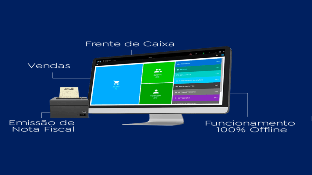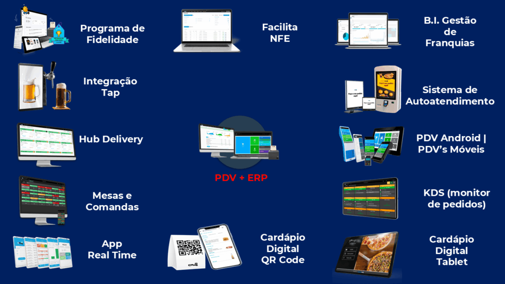 Registro de vendas via balcão, delivery, mesas e comandas; ● Cadastro de clientes; ● Recebimento de pedidos de integração delivery; ● Inserção e remoção de crédito de clientes; ● Sangria e reforço de dinheiro no caixa; ● Devolução e troca de mercadorias; ● Impressão de relatórios gerenciais de vendas, pedidos, notas fiscais, cupons de troca e fechamento de caixa; ● Imagem de produto no PDV; ● KDS – função exclusiva para monitoramento de pedidos; ● Cada módulo PDV contratado já inclui um usuário.