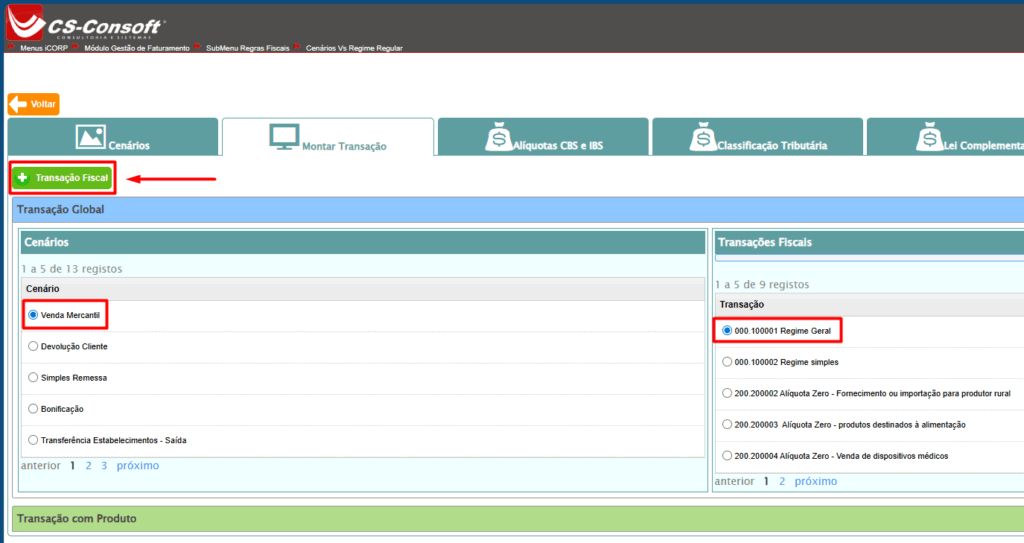 – Selecione o Cenário: “Venda Mercantil”, e selecione a Transação Fiscal: “000.100001 Regime Geral”;