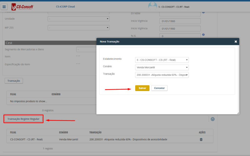 Criar Cenário: Configuração Regime Regular, clique em Montar Transação: